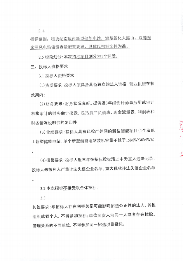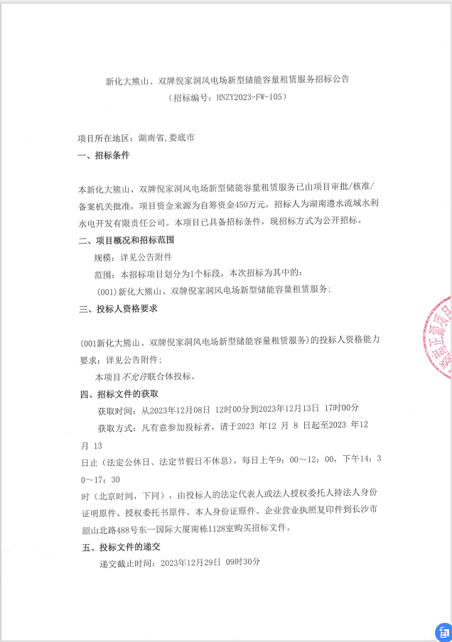 新化大熊山、雙牌倪家洞風(fēng)電場新型儲能容量配置租賃服務(wù)招標公告 來源:企管部 發(fā)布時間:2024-01-26 瀏覽數(shù): 次 【字體:小 大】 (本公告僅用于司務(wù)公開,以招標公告指定發(fā)布平臺為準) 【打印正文】 分享到: